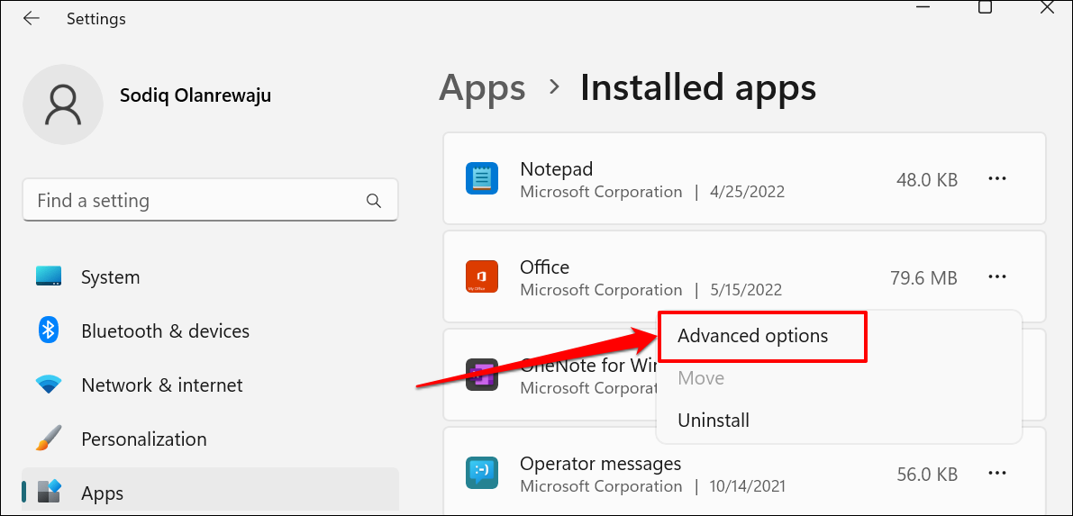 - If Windows doesn’t display the Office version in the app preview, there’s another way to check. Select the three-dot menu icon next to the Office application and select Advanced options.