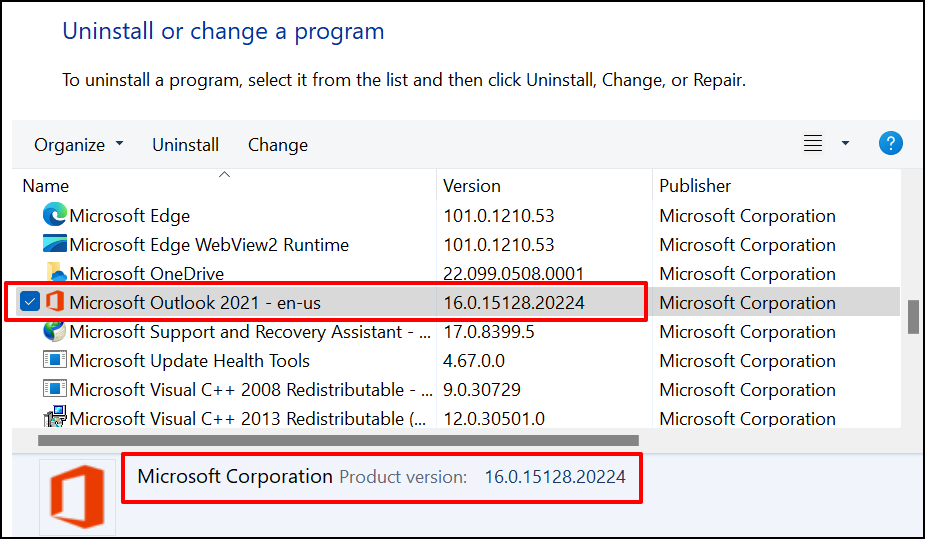 - Locate the Office app and check the “Version” column for its version. Alternatively, select the app and check the bottom of the Control Panel windows for its product version.