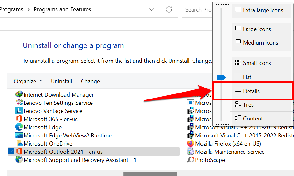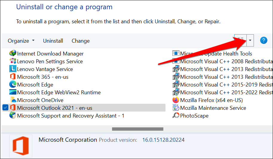 - Switch to a detailed view mode if the Control Panel doesn’t display the “Version” column on the page. To do so, select the More options drop-down button in the top-right corner of the app list.