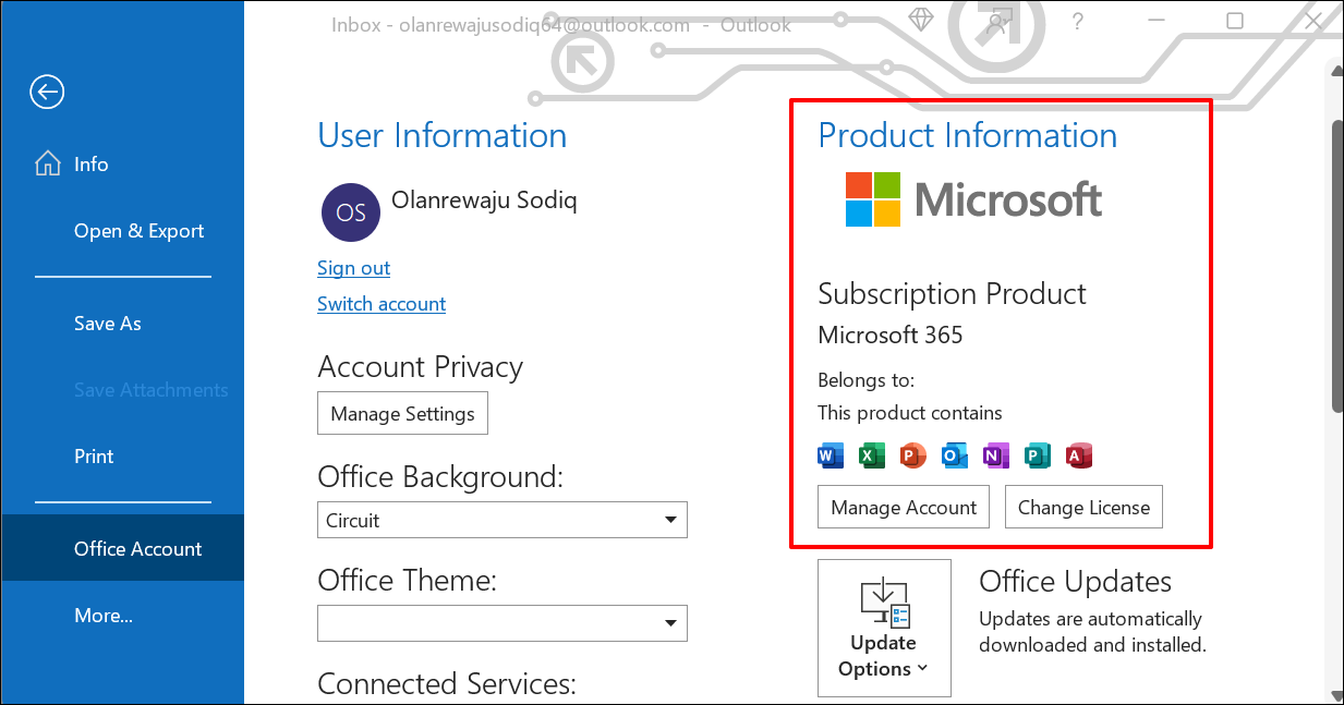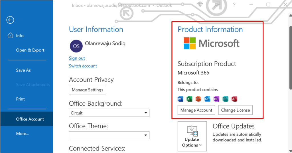 In some Office applications, select Account in the File menu.