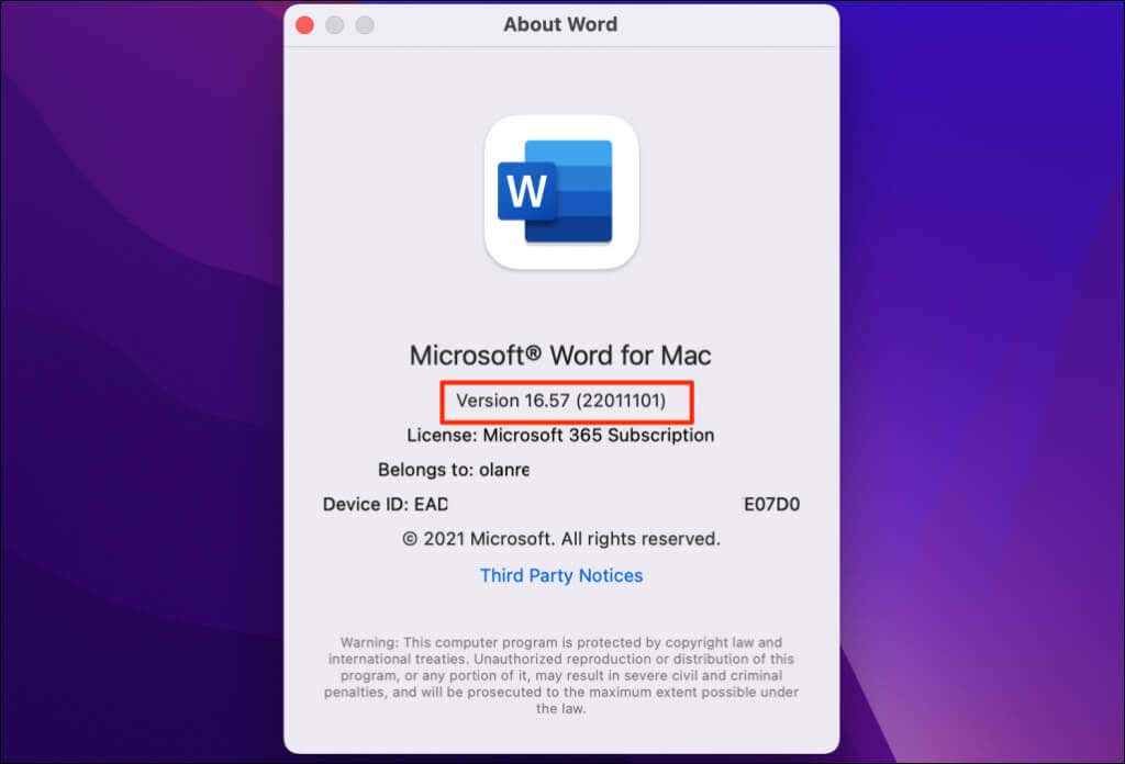 Checking the app versions of Microsoft Office for Mac is straightforward. The procedure is consistent for all Office applications—irrespective of their versions.