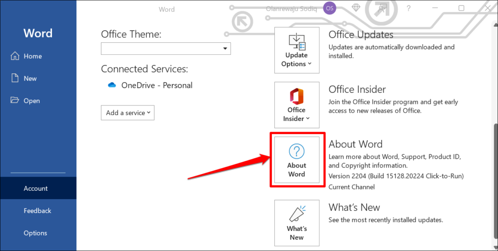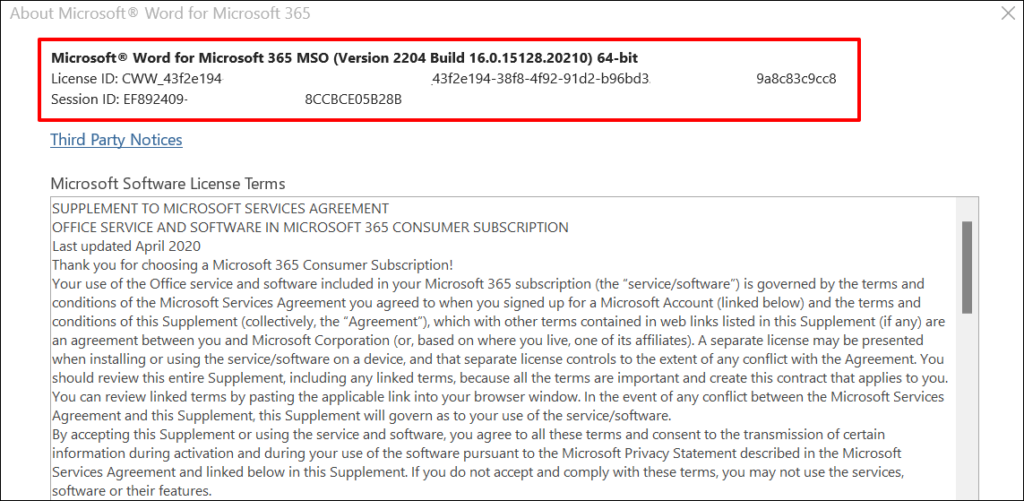 For instance, selecting About Word will reveal Microsoft Word’s License ID, version, and build number in a new window. You can also check whether you have a 32 or 64-bit version of Microsoft Word in the dialog box.
