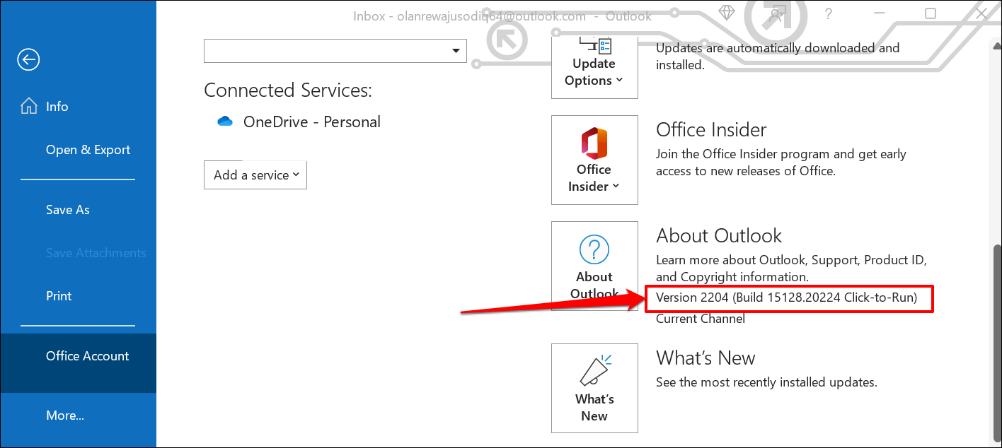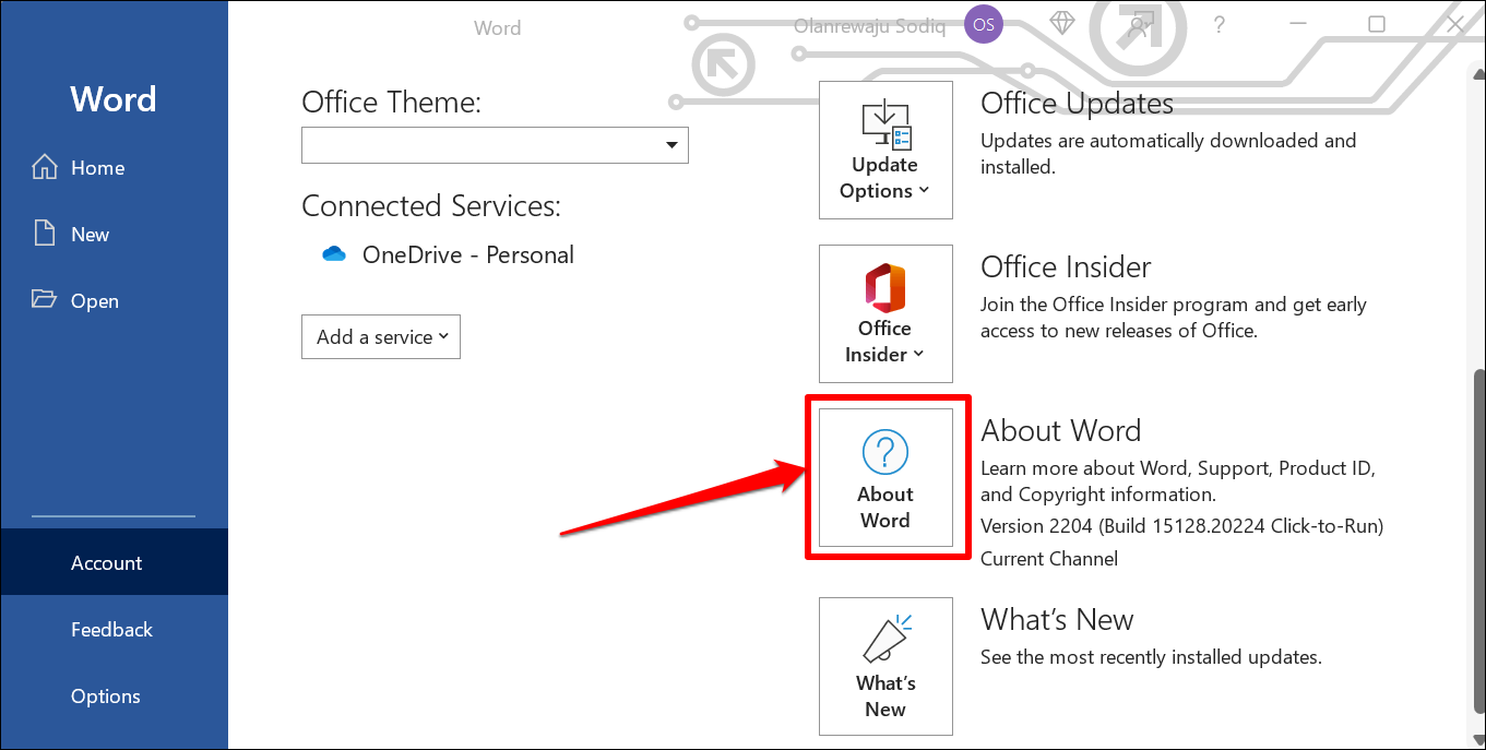 Check Office Version in Account Settings Menu